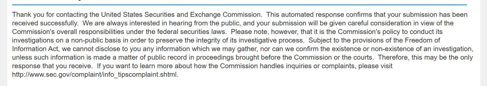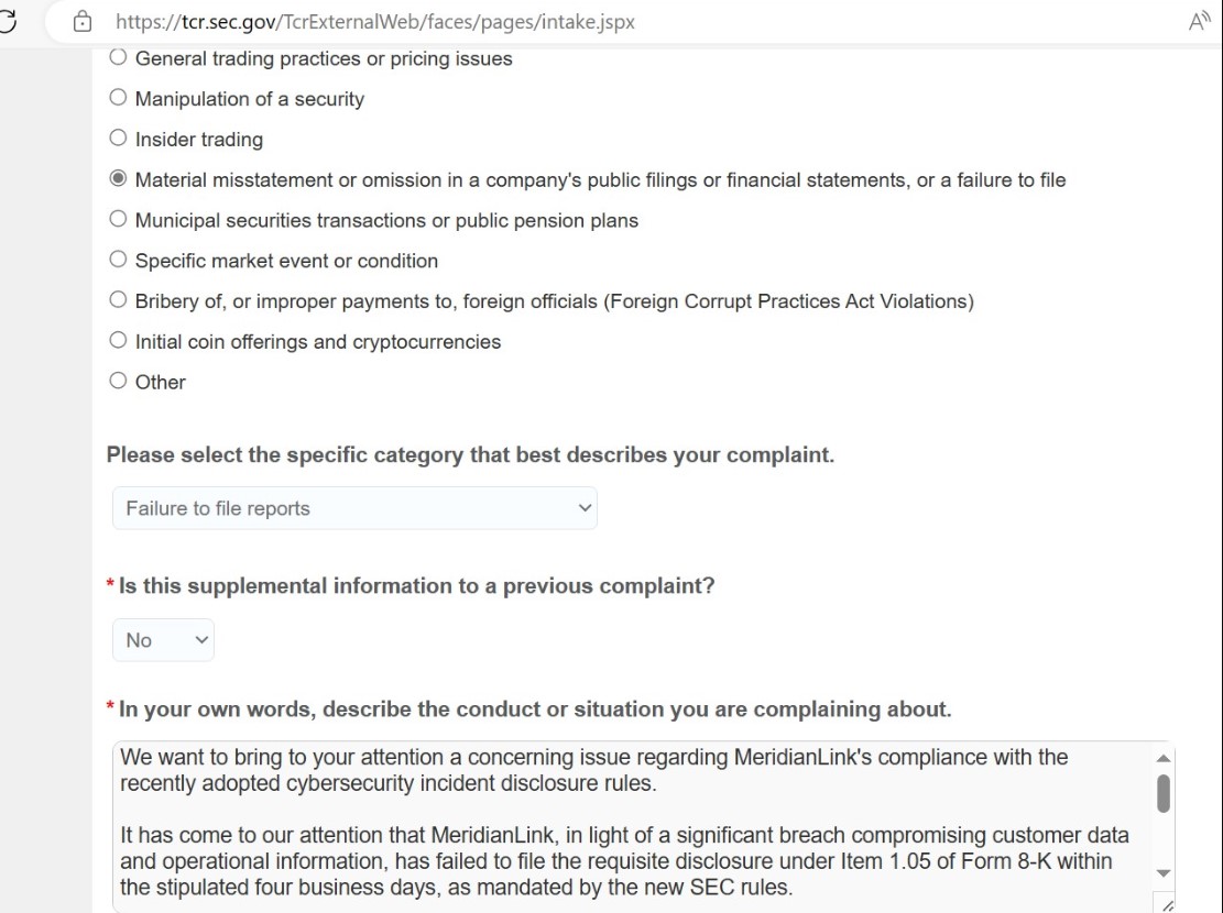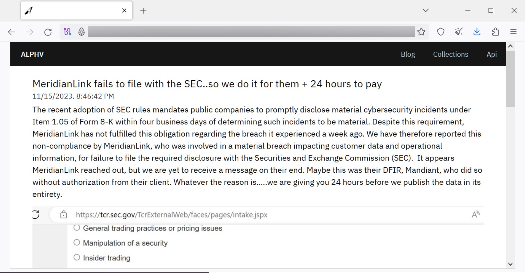 La supuesta falta de respuesta de la empresa probablemente llevó a los hackers a ejercer más presión al presentar una queja ante la Comisión de Valores y Bolsa de los Estados Unidos (SEC) sobre que MeridianLink no reveló un incidente de ciberseguridad que afectó "datos de clientes e información operativa".