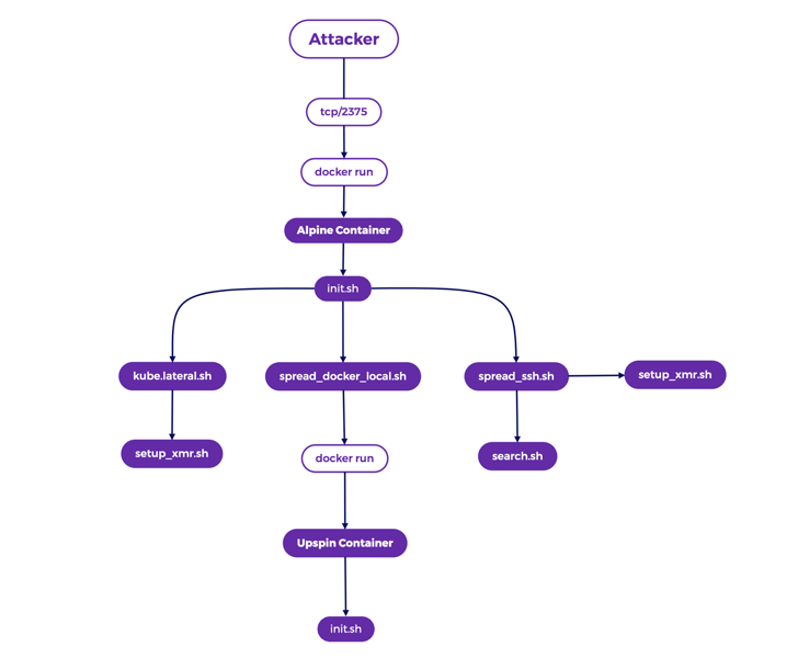 La imagen upspin está diseñada para ejecutar el script init.sh antes mencionado, permitiendo así que el malware del grupo se propague en forma de gusano a otros hosts Docker.