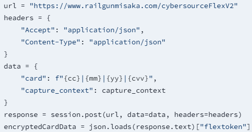 En el siguiente paso, en lugar de enviar la tarjeta robada directamente a la pasarela de pago, la envía a un servidor controlado por el atacante (railgunmisaka.com), que se hace pasar por CyberSource y devuelve un token falso para la tarjeta.