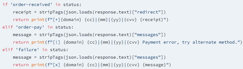 El script se dirigía específicamente a las tiendas WooCommerce que utilizan la pasarela de pago CyberSource para validar las tarjetas, lo cual es un paso clave para los actores de carding que necesitan evaluar miles de tarjetas robadas de vertederos de la web oscura y bases de datos filtradas para determinar su valor y potencial explotación.