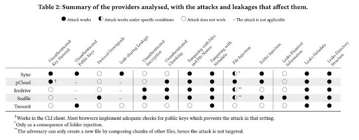 «Además, aunque algunos de estos ataques no son novedosos desde una perspectiva criptográfica, ponen de relieve que el almacenamiento en la nube E2EE, tal y como se despliega en la práctica, falla a un nivel trivial y a menudo no requiere un criptoanálisis más profundo para romperlo.»