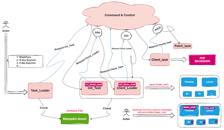 "Estas cargas útiles son altamente modulares, capaces de funcionar de forma independiente o de ejecutarse secuencialmente a través de task_loader para formar un marco de ataque integral", dijo XLab. "Toda la ejecución del código se produce dentro de los procesos PHP o PHP-FPM (FastCGI), lo que garantiza que no se deje ninguna carga útil de archivo atrás, logrando así una huella sigilosa".