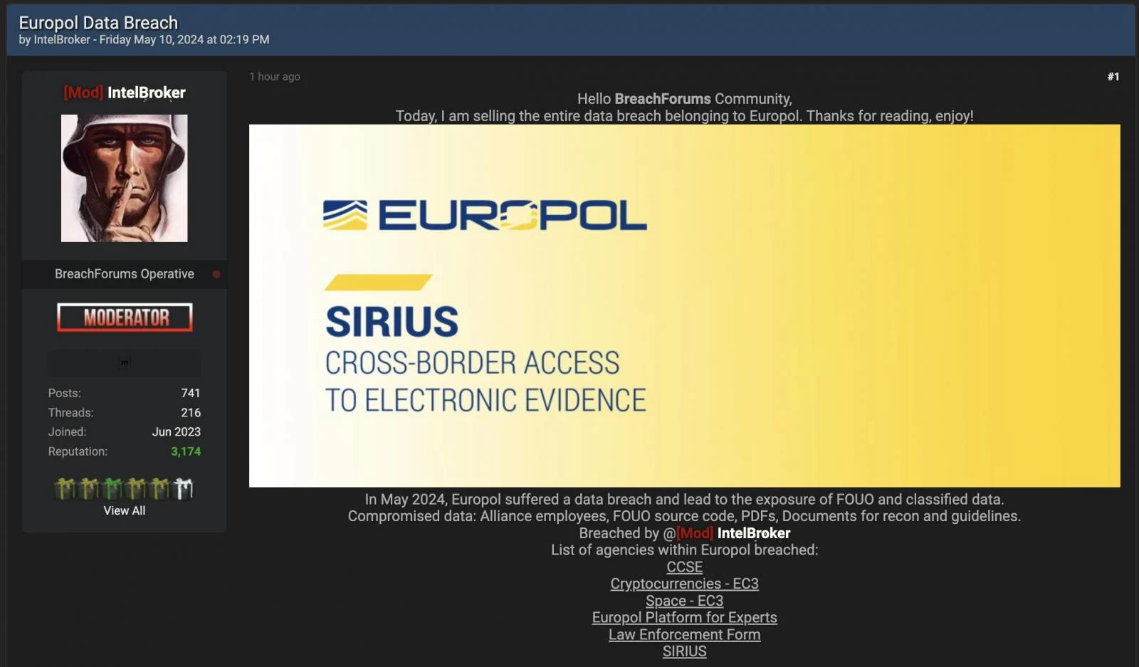 IntelBroker también afirma haber puesto en peligro la plataforma SIRIUS utilizada por las autoridades judiciales y policiales de 47 países, incluidos los Estados miembros de la UE, el Reino Unido, los países que tienen un acuerdo de cooperación con Eurojust y la Fiscalía Europea (EPPO).