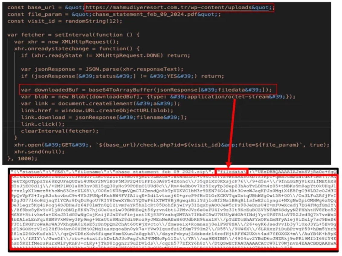 De este modo, cuando se engaña a un visitante para que abra la página maliciosa desde un correo electrónico de phishing, el navegador descodifica el script y extrae la carga útil en el dispositivo anfitrión, eludiendo así los controles de seguridad típicos, como las pasarelas de correo electrónico que sólo inspeccionan los archivos adjuntos sospechosos.