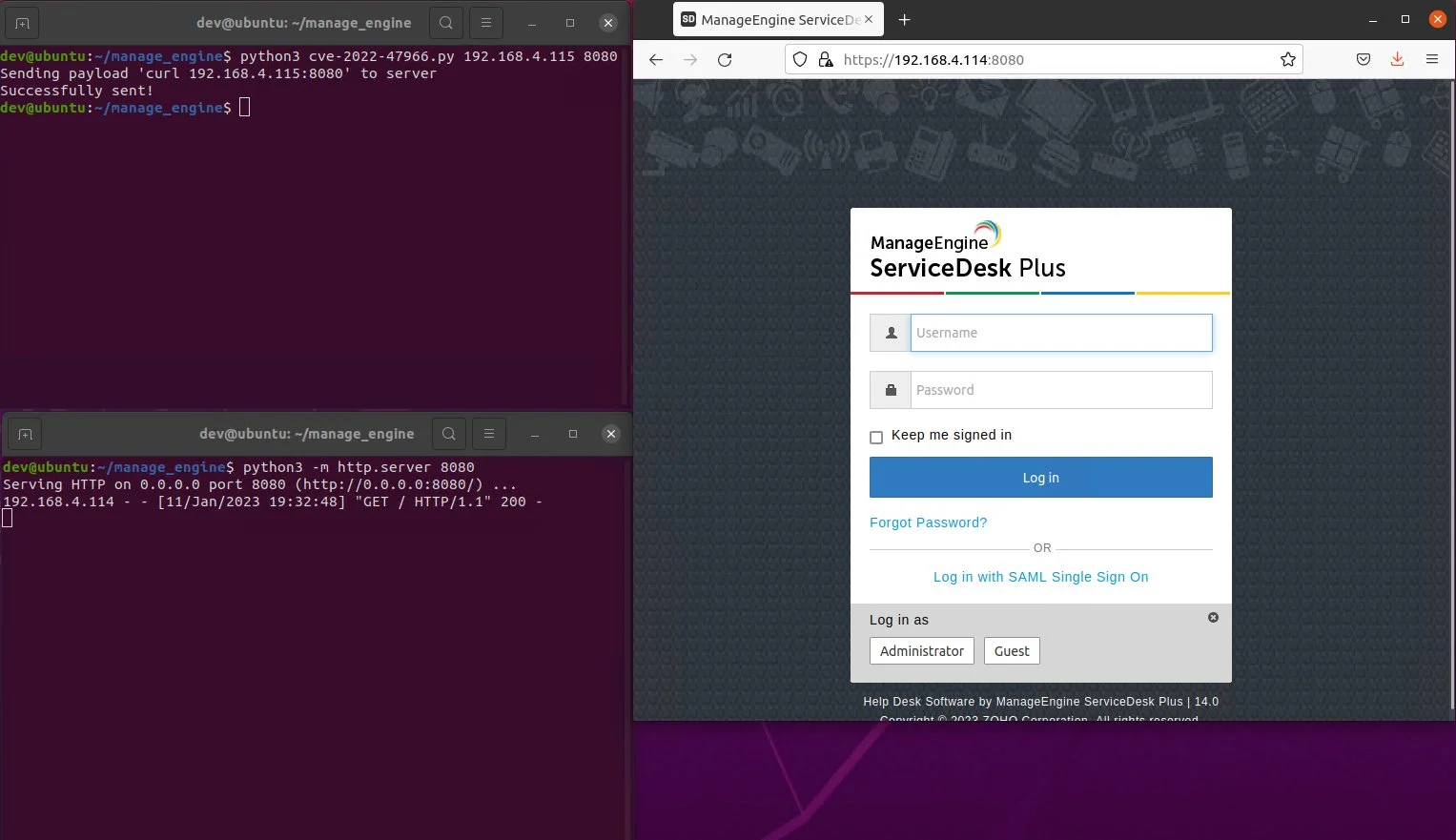 Los investigadores de Horizon3 también han compartido la siguiente captura de pantalla que muestra su exploit en acción contra una instancia vulnerable de ManageEngine ServiceDesk Plus.