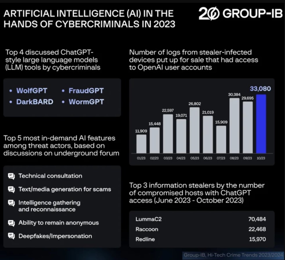 Según Group-IB, los adversarios pueden utilizar los LLM para idear nuevos métodos, elaborar ataques convincentes de estafa, phishing y mejorar la productividad operativa, pero esta tecnología también puede acelerar el reconocimiento, ejecutar conjuntos de herramientas de pirateo y realizar llamadas automáticas de estafa.