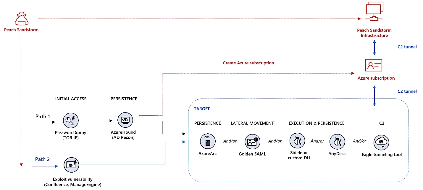 Otras cadenas de ataque montadas por Peach Sandstorm han implicado la explotación de fallos de seguridad en Atlassian Confluence (CVE-2022-26134) o Zoho ManageEngine (CVE-2022-47966) para obtener acceso inicial.