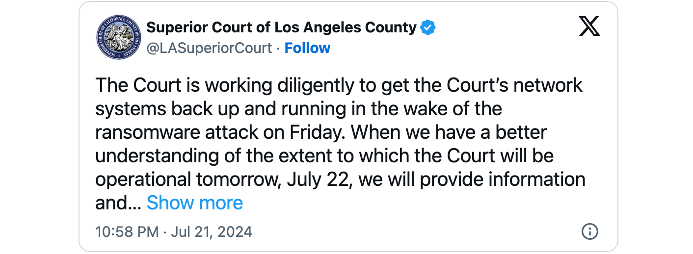 El ataque se dio a conocer el sbado, cuando el Tribunal revel que comenz en la madrugada del viernes 19 de julio. El Tribunal Superior de Los ngeles (LASC) dijo que el incidente no estaba relacionado con la interrupcin mundial en curso que afecta a los sistemas Windows despus de una actualizacin defectuosa de CrowdStrike.