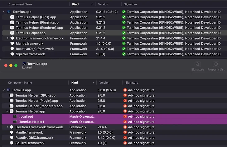 "El malware se entrega a través de una imagen de disco .dmg y contiene una versión hackeada de la genuina Termius.app", dijeron los investigadores. "Dado que el paquete de aplicaciones dentro de la imagen de disco ha sido modificado, los atacantes han sustituido la firma de código del desarrollador por su propia firma ad hoc con el fin de pasar las reglas de firma de código de macOS".