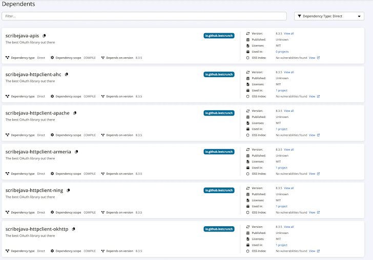 "Todos ellos son paquetes legítimos typosquatting pero comparten el mismo groupId (io.github.leetcrunch) en lugar del espacio de nombres real (com.github.scribejava)".